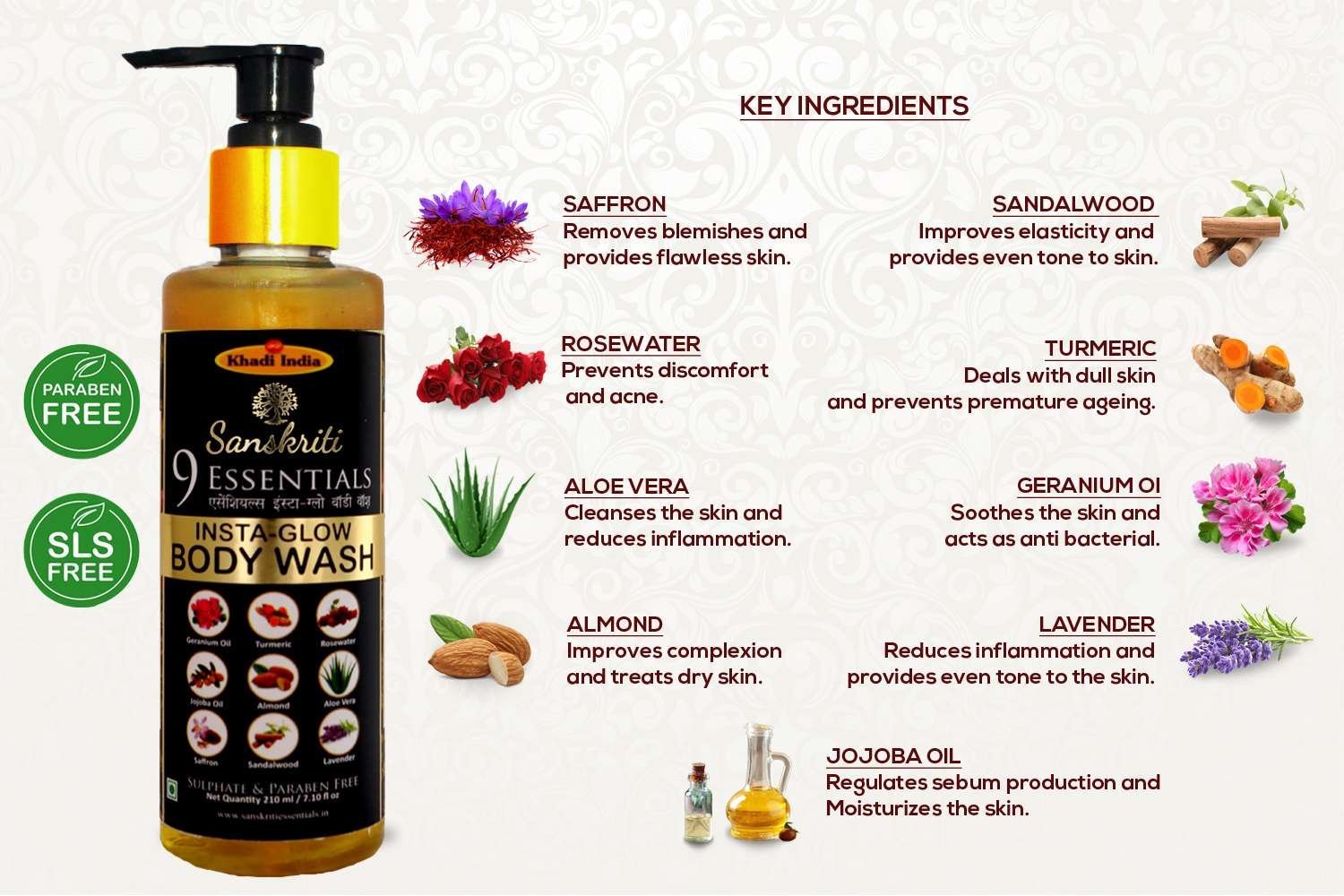 Loaded with anti-oxidants and anti-bacterial properties, the body wash gives a toned & flawless skin, the Geranium Oil content soothes the skin & improves elasticity, whereas the Rose water extract prevents acne, blemishes & hyper-pigmentation. The Turmeric content imparts anti-inflammatory & antiseptic nature to the body wash which cleanses the body, sandalwood provides anti-aging benefits by reducing wrinkles & signs of ageing, whereas saffron is considered to be one of the best ingredients to provide a youthful & radiant glow to the skin.