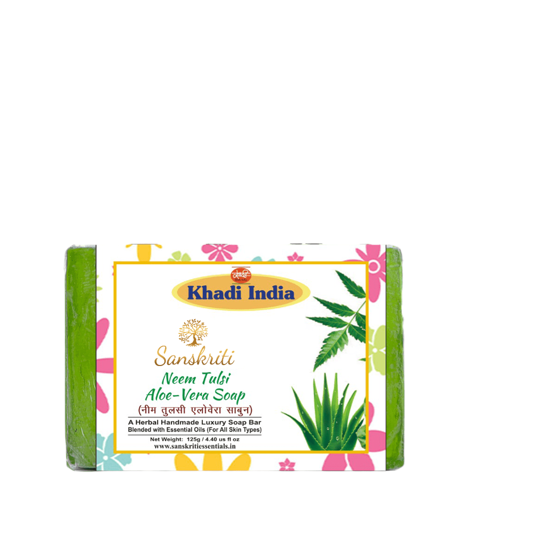 Khadi –Neem Tulsi Aloe Vera Soap The Goodness Of Aloe Vera Essential Oil, Basil & Neem Oil Makes This Soap Perfect For Skin Lightening, Acne, Wrinkles & Dryness Issues. It Has Hydrating & Anti-ageing Effects. It Promotes Clear Skin, Reduces Blemishes, Age Spots And Gives Even Tone To The Skin.