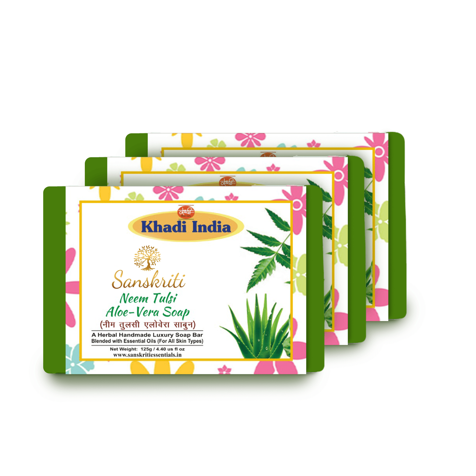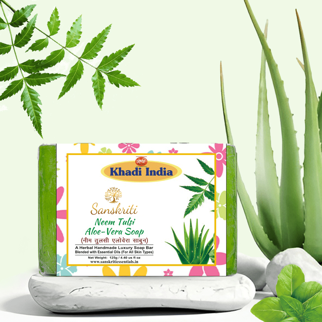 • Khadi –Neem Tulsi Aloe Vera Soap The Goodness Of Aloe Vera Essential Oil, Basil & Neem Oil Makes This Soap Perfect For Skin Lightening, Acne, Wrinkles & Dryness Issues. It Has Hydrating & Anti-ageing Effects. It Promotes Clear Skin, Reduces Blemishes, Age Spots And Gives Even Tone To The Skin.