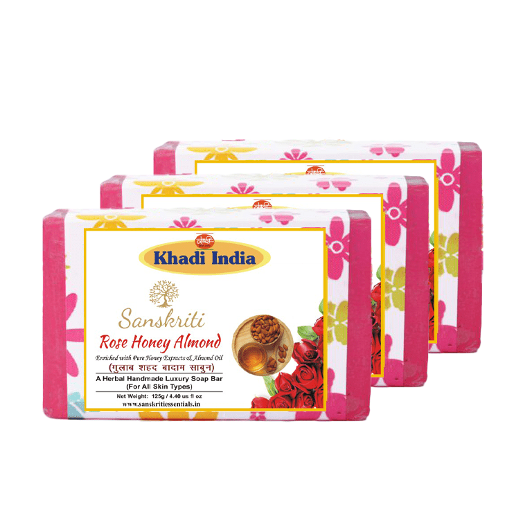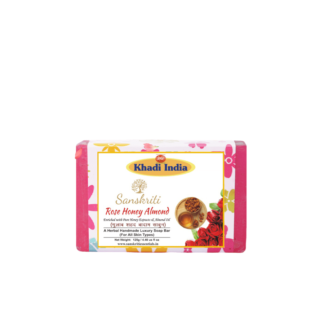 Khadi –Rose Honey Almond Soap Enriched with the goodness of Rose Water, Almond Oil & Honey Extracts, this soap has anti-bacterial & antiseptic properties. It keeps the skin moist, & free from acne & blackheads. It helps to boost the skin glow & reduces puffiness, Almond Oil helps to refine skin texture by reducing signs of aging. It lightens & improves the skin tone along with brightening the complexion. It reverses the skin damage if used on daily basis.