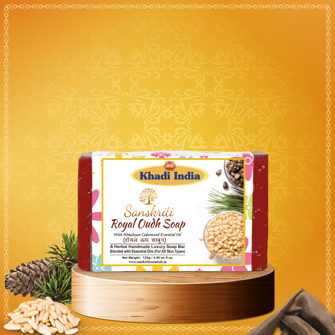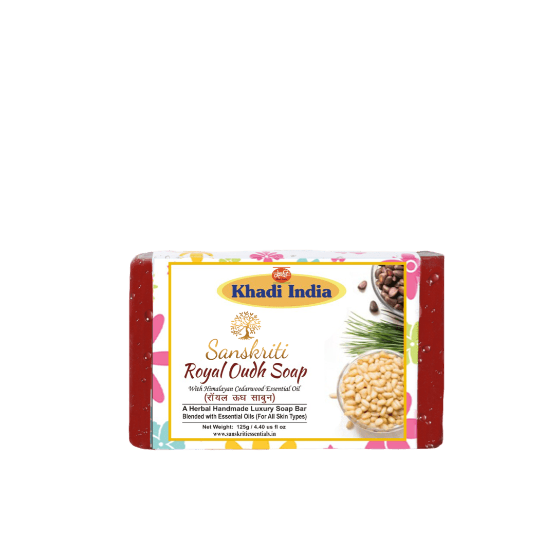 KHADI -Royal Oudh Soap Enriched With The Goodness Of Himalayan Cedarwood Essential Oil, The Soap Is Used In Moisturizing Skin, Treating Acne, Scars, Minor Wounds, Pimples, Blackheads& Whiteheads, Whereas The Royal Oudh Fragrance Engages A Pleasant & Sweet Scent To The Soap.